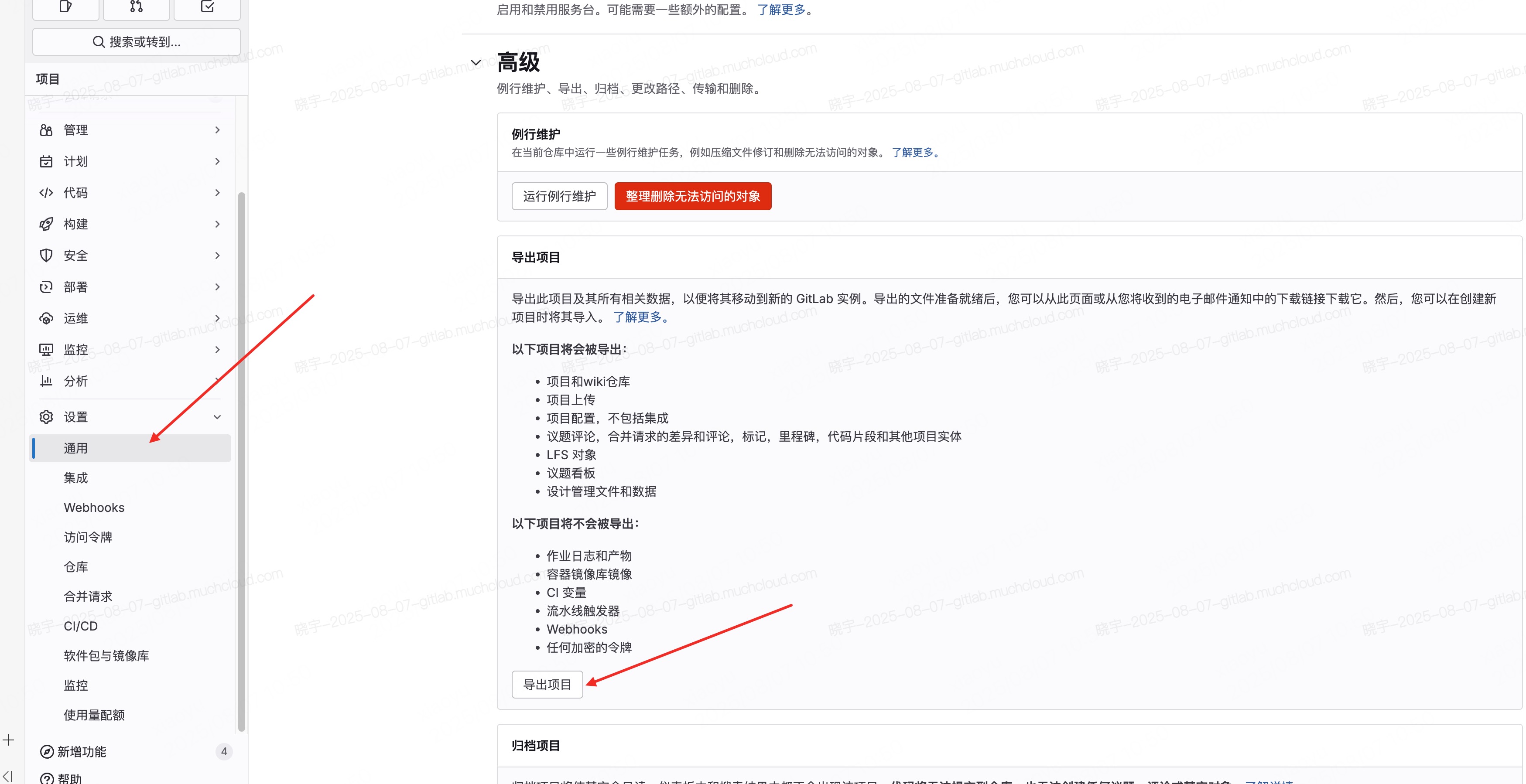 项目导出过程:在旧的GitLab实例中,您需要登录并访问您想要迁移的项目。在项目页面上,找到并点击“Settings(设置) > General(通用)”,滚动到“Advanced”部分,点击“Export project”。GitLab将开始打包项目数据,并在完成后通过邮件发送下载链接。